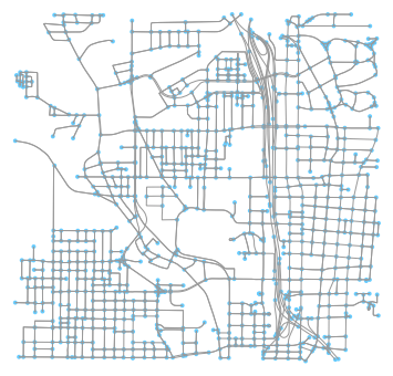 In the above graph, we can see all the nodes (blue) and edges (gray) representing the roads with exact shapes. Let’s take a deep-dive into the graph object we downloaded and see how the edges and nodes look likes:
