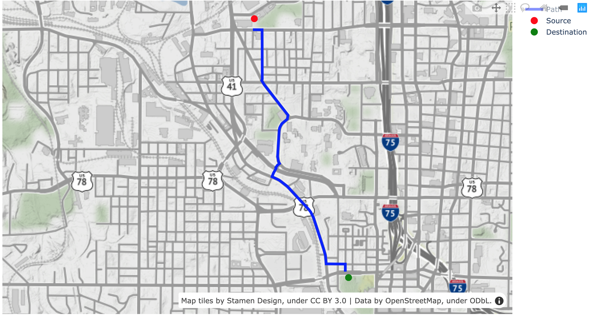 and destination point, plots a path on a map
